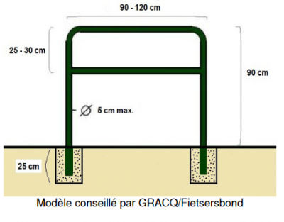 - Une structure sur laquelle accrocher le cadre du vélo à deux points fixes. Les U inversés sont les plus connus. Faciles à mettre en place, ils conviennent pour quasiment tous les vélos. On choisira donc ce type d'accroche ou équivalent (par exemple les râteliers type « Ville de Gand »).