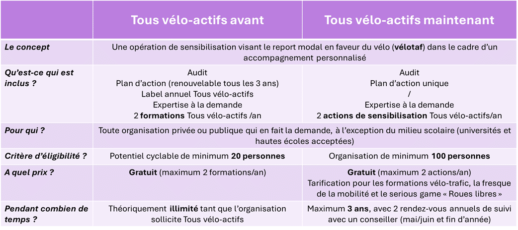 - L’accompagnement prend fin pour les organisations vélo-actives depuis au moins 3 ans. Les animations déjà programmées avant cette date seront honorées.